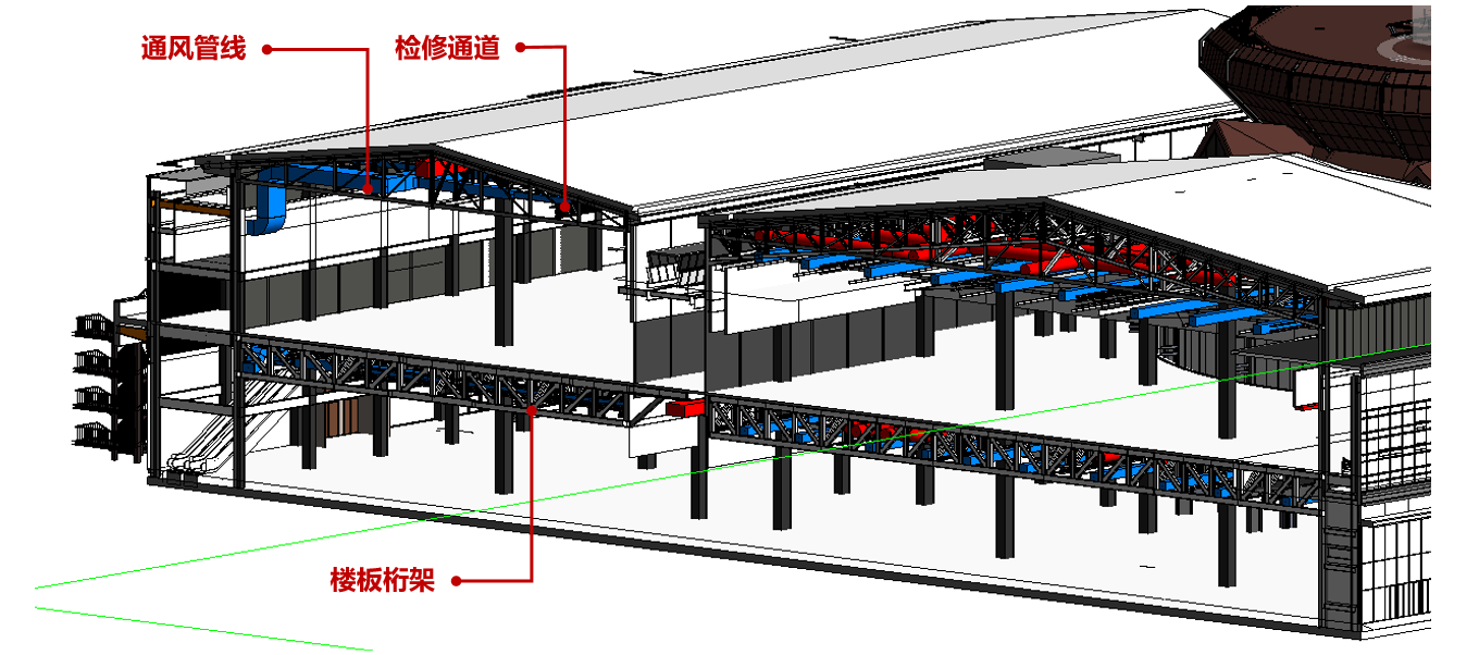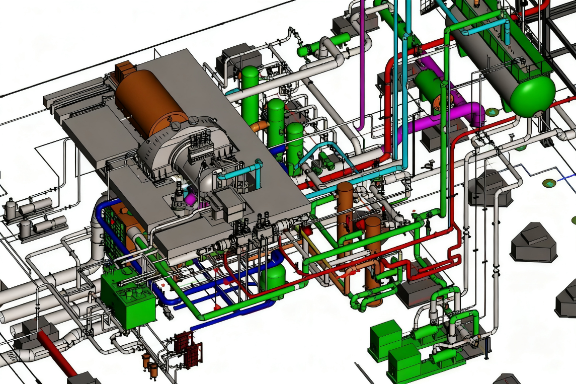 項目全過程采用BIM建模、出圖、分析計算、跨專業協同,最終實現設計成果數字化交付,并對整套發電機組系統建立各專業管道、結構模型,利用協同平臺進行各專業模型總裝并完成管道碰撞檢查,確保各專業管道路由更加合理,從而提升施工效率,顯著降低材料損耗與返工延誤。