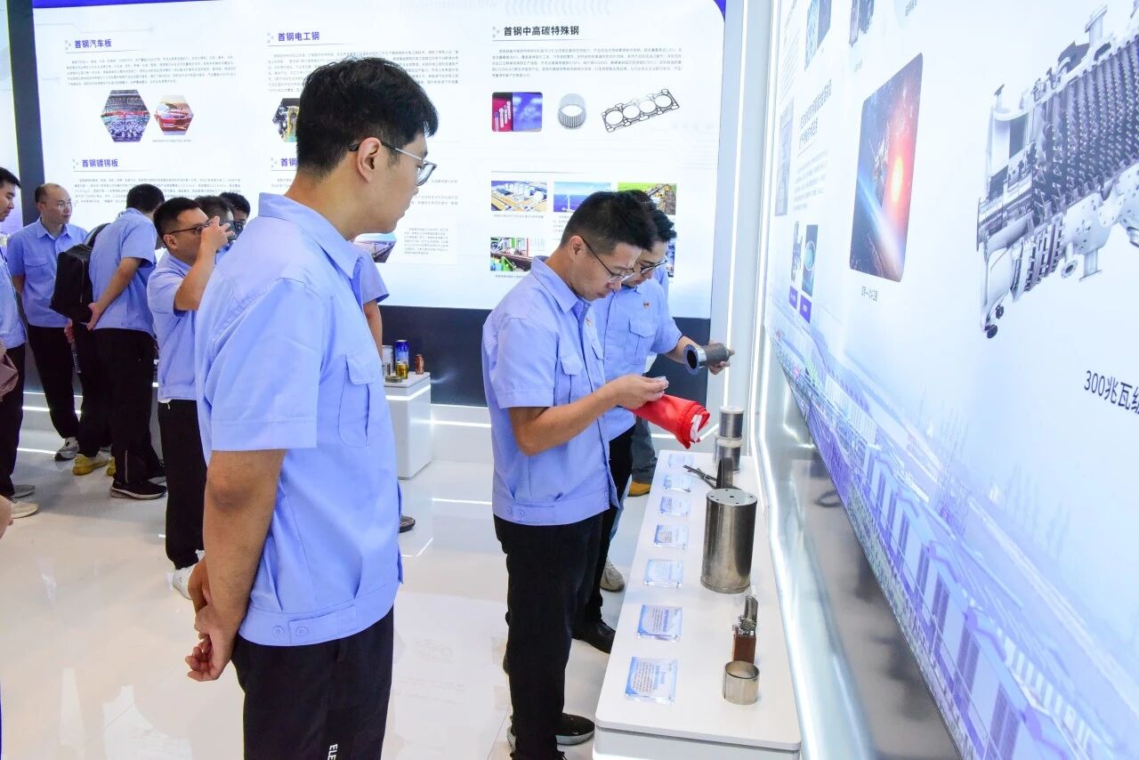 隨后的“技術(shù)創(chuàng)新”版塊,集中展示了包括“氫基豎爐直接還原鐵+電爐煉鋼” 技術(shù)、智能化重載運(yùn)輸技術(shù)在內(nèi)的30項突出技術(shù)成果,以及汽車板、電工鋼、北斗衛(wèi)星原子鐘屏蔽裝置等30余件實物展品,令人矚目。