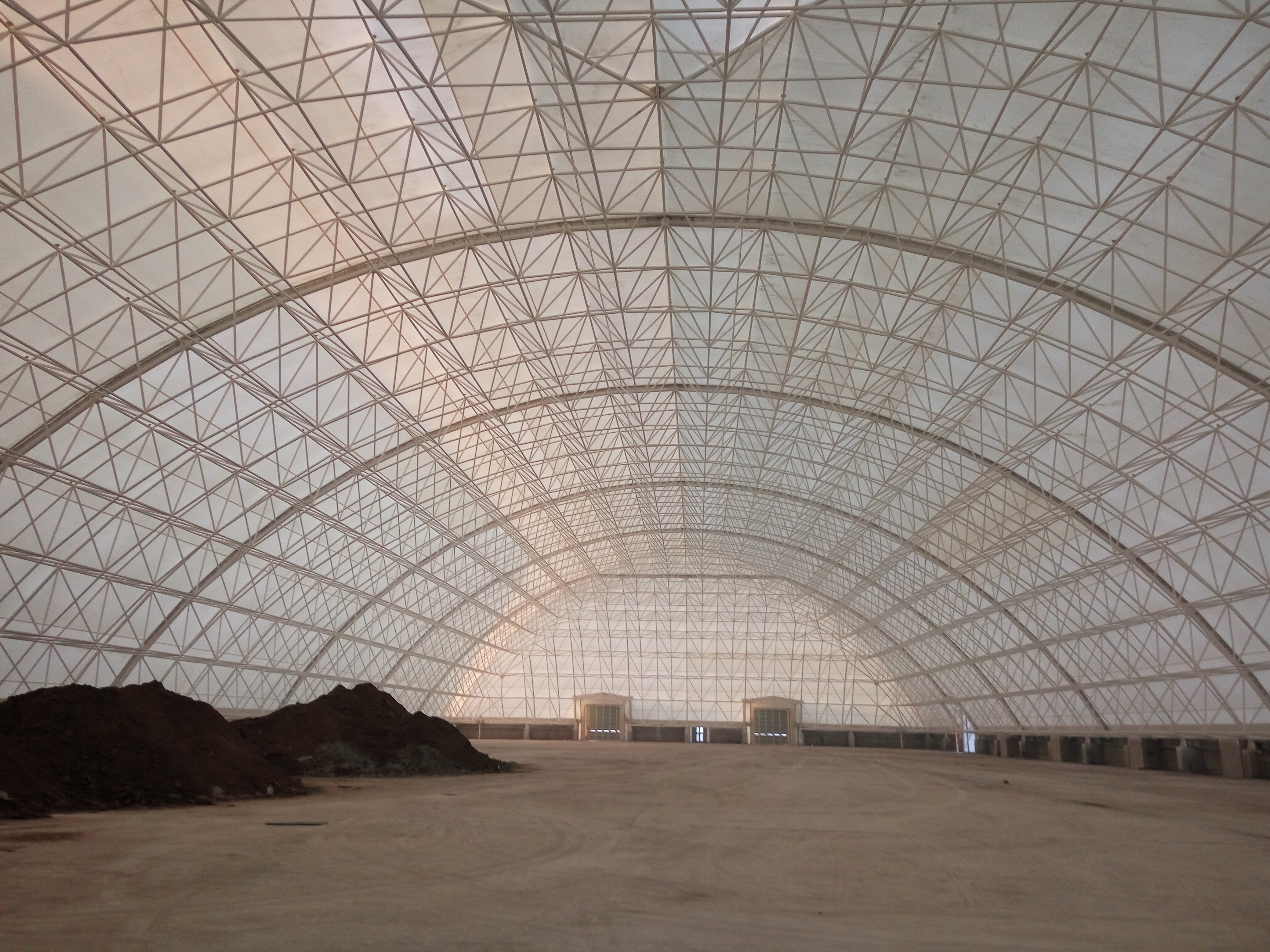 首鋼京唐能源部煤料場封閉 長度290m,跨度145m,網殼矢高高44.486m,目前正在施工。