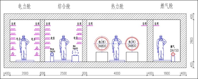 規(guī)劃建設(shè)綜合管廊長(zhǎng)度28公里,綜合管廊斷面尺寸分別為:雙艙6.2m*3.6m,三艙室8.9m*3.5m,容納供水、再生水、熱力、電力線纜、電信管道、燃?xì)獾仁姓芫€。
