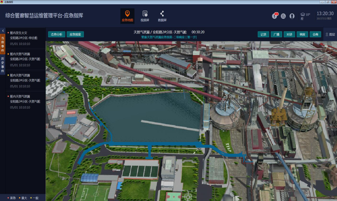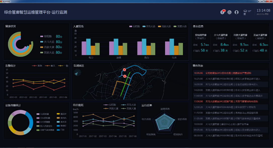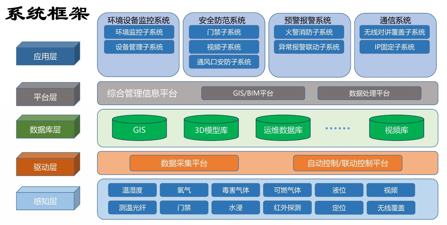 基于物聯(lián)網(wǎng)技術(shù),集成了3D可視化技術(shù)、傳感感知技術(shù)、大數(shù)據(jù)云計(jì)算技術(shù)、輔助決策技術(shù)、無線通信技術(shù)、自動(dòng)控制技術(shù),能夠?qū)崟r(shí)對(duì)管廊內(nèi)環(huán)境及各種主管線運(yùn)行的數(shù)據(jù)進(jìn)行顯示、分析、更新、維護(hù)、統(tǒng)計(jì),全方位地支撐了管廊權(quán)屬單位的日常運(yùn)營(yíng)、維護(hù)、管理以及突發(fā)事件發(fā)生時(shí)的應(yīng)急處置。